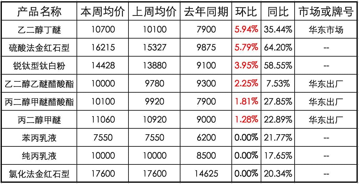 【中國涂料采購網】涂料產業鏈相關產品周度價格表