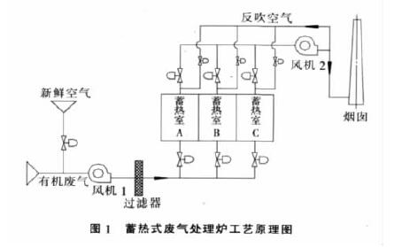 RTO設備的工作原理見圖1。該設備有3個對稱的蓄熱室和2個燃燒室,有機廢氣在鼓風機作用下先進入陶瓷蓄熱室A,吸熱后進入燃燒室,蓄熱室A因放熱而降溫,燃燒升溫后的氣體進入蓄熱室B,通過熱交換把熱量蓄存在蓄熱室B的陶瓷蓄熱體中,然后排出。同時蓄熱室C空間中殘留未處理有機廢氣被凈化后的氣體反吹回燃燒室進行焚化處理。經過一定時間(約2min)后,氣流改變方向從蓄熱室B進入燃燒室,通過蓄熱室B吸收熱量升溫后,在爐膛內高溫焚化,最后經蓄熱室C熱交換后排放,同時蓄熱室A處于反吹掃狀態,經一定時間(約2min)后,氣流再改變方向,不斷地交替循環,保證燃燒室溫度在800°C以上,從而保證高的去除率和換熱效率。