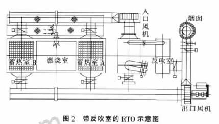 換向周期短,換向過程中有廢氣外排的現象,為解決這一問題,最佳方式為3室RTO,但造價昂貴,為解決這一難題,采用2室RTO的同時減少外排。設計了一種基于2室同時增加反吹功能的RTO,就是2室RTO加上反吹室,見圖2。