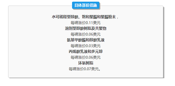 【中國涂料采購網】美國Reichhold公司宣布,將對公司出產的所有溶劑型醇酸樹脂、水稀釋型醇酸樹脂及共聚物、醇酸乳液、丙烯酸乳液、多元醇、聚氨酯、環氧樹脂、飽和聚酯和聚酯粉末涂料樹脂等產品進行漲價,本次漲價范圍適用于在美國和加拿大銷售的所有產品,涉及2017年3月20日當天或之后發貨的所有訂單。