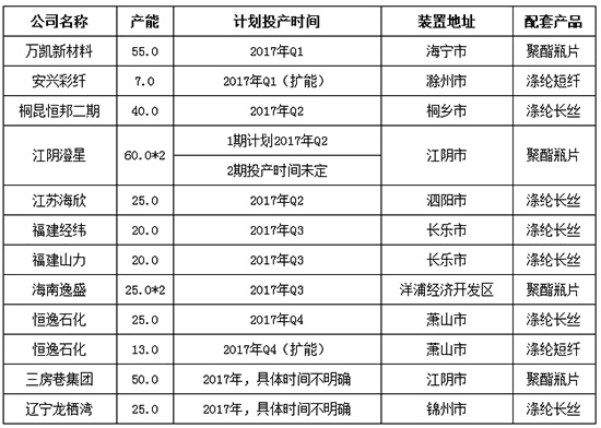 【中國涂料采購網】據統計數據顯示,2017年1-12月,國內聚酯計劃新增產能450.0萬噸。其中,投產時間相對明確的產能合計315.0萬噸,這其中68.3%的產能投產時間集中于二、三季度。具體到子行業來看,滌綸長絲計劃增加155.0萬噸,占比34.4%;滌綸短纖計劃增加20.0萬噸,占比4.4%;聚酯瓶片計劃增加275.0萬噸,占比61.1%。