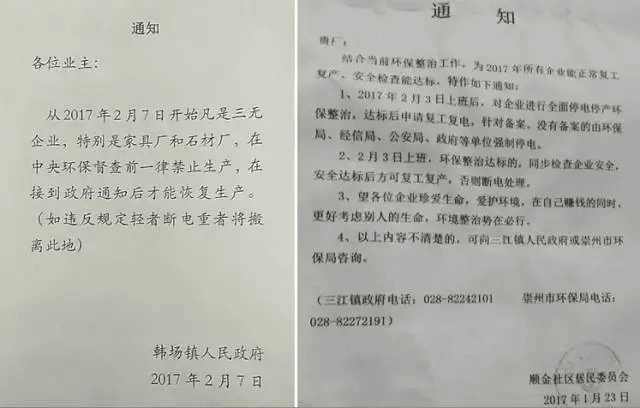 2月7日,2017年四川省環境保護工作會議上,省環保廳廳長于會文強調,2017年成都平原地區大氣污染治理是全省環保“一號工程”。在2017年3月31日之前,成都市所有的“三無”企業都要強制關停。整治行動開始以后,成都市雙流區、武侯區各部門及街道聯合行動,對各家不達標的工廠進行地毯式的檢查,眾多印染、涂料、鞋材等工廠已人心惶惶。