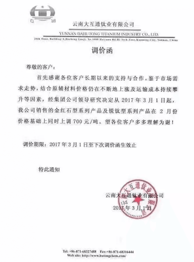 3月1日云南大互通鈦業(yè)有限公司,發(fā)出漲價(jià)通知: