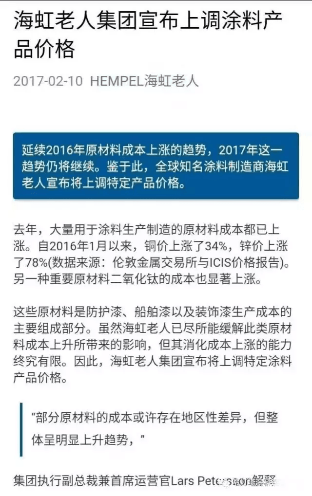 【中國涂料采購網】近日,國外的一些涂料企業,迫于原材料價格持續上漲的壓力,終于忍無可忍紛紛宣布提高產品價格。去年大量用于涂料生產制造的原材料成本都已上漲,自去年1月以來,銅價上漲了34%,鋅價上漲了78%。另一種重要原材料二氧化鈦的成本也顯著上漲。這些原材料是防護漆、船舶漆以及裝飾漆生產成本的主要組成部分,雖然海虹老人已盡所能緩解此類原材料成本上升所帶來的影響,但其消化成本上漲的能力終究有限,因此,海虹老人集團宣布將上調特定涂料產品價格。此外,南京長江涂料有限公司因化工原材料、顏填料、輔助材料大幅漲價,物流費用也不斷上漲,導致一些品種出現負毛利,于2月21日起調整部分產品價格。佐敦涂料由于2016年多種油漆的原材料成本大幅上漲,雖盡力消化油漆成本的大幅上升,但難以為繼。因此不得不決定2月6日起,大幅上漲相關產品價格26%到40%。除此之外,三棵樹涂料、嘉寶莉化工、廣東巴德士等國內知名涂料企業也紛紛提價。國外涂料企業帶頭提價,終于讓國內的一些中小型企業看到了希望,涂料企業終于迎來了漲價的春天。