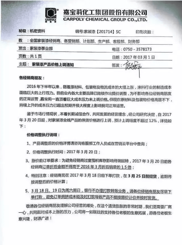 面臨原材料持續不斷地漲價,涂料企業忍氣吞聲地度過了2016年,2017年,原材料漲價依然猛烈,已經有相當一部分的涂料企業已經到了虧損的邊緣,已經到了不漲就死,漲了就丟客戶的尷尬境地。近日行業內的帶頭大哥終于出現了,這次這幾家行業的龍頭企業帶動涂料企業漲價,很快會引發行業內的骨牌效應,帶動國內的大批其他涂料企業跟進。