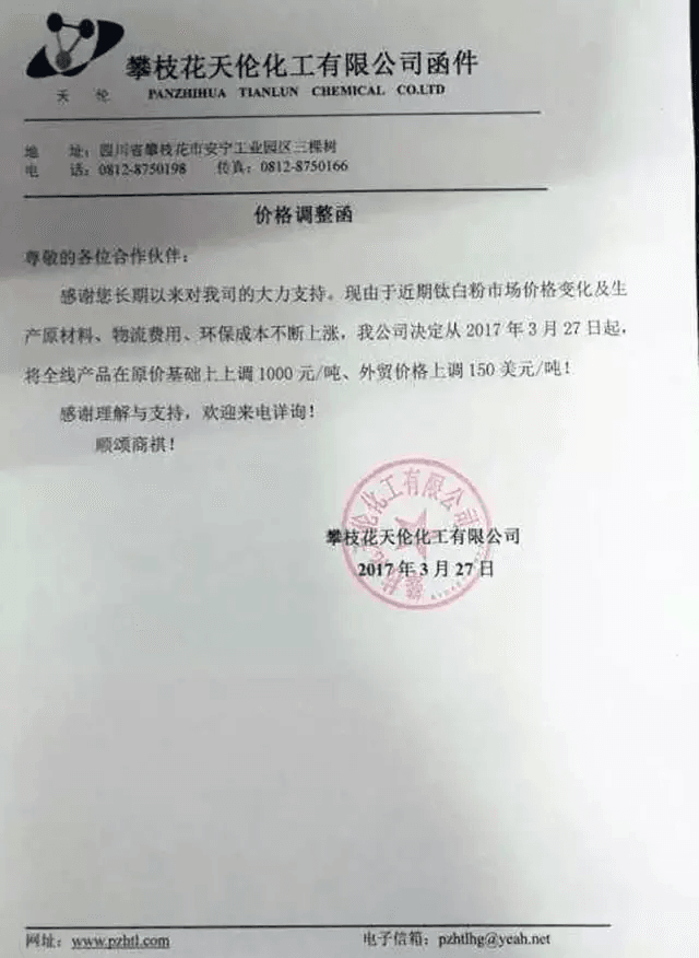 國外涂料企業相繼宣布漲價之后,國內原材料企業也迅速加入漲價的大潮中,3月27日,湛新樹脂(上海)有限公司,由于原材料間苯二甲酸市場和新戊二醇供應緊張導致價格持續上漲,決定自4月1日起,開始對產品到貨價格實施如下上調政策(含稅價格):戶內、戶外、ADDITOL 產品:人民幣400元/噸;超耐候產品:人民幣700元/噸;除了PPG、威士伯、湛新上調產品價格外,攀枝花天倫化工有限公司也發出調價通知,決定從2017年3月27日起,將全線產品在原價基礎上上調1000元/噸、外貿價格上調150美元/噸!