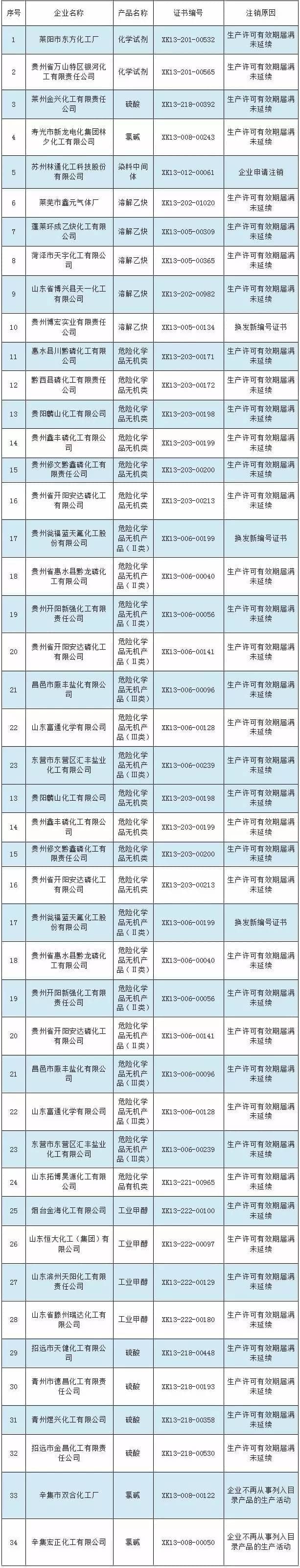 根據《中華人民共和國工業產品生產許可證管理條例》(國務院令第440號)、《質量監督檢驗檢疫行政許可實施辦法》(質檢總局令第149號)和《中華人民共和國工業產品生產許可證管理條例實施辦法》(質檢總局令第156號),因換發省級證書、生產許可有效期屆滿未延續、企業依法整體關停退出等情形,質檢總局已注銷浙江金質麗化工有限公司等200多家企業工業產品生產許可證,現將名單予以公布。