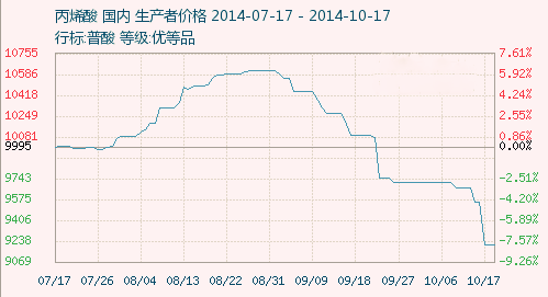 據榜數顯示,本周(10月13-17日)丙烯酸出廠企業報價繼續下調。截止周末國內丙烯酸出廠均價在9210元/噸,較周初下調3.61%,國內丙烯酸企業出廠報價同比去年下跌了31.93%。