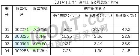 【中國涂料采購網】在很多時候,我們不管是對行業、企業發展進行評估、預測,看到的都是利好的一面,而有時候有些地方我們注意不到,而這些被我們忽略的地方往往最能反映出問題的真實性。2014年已進入最后的沖刺階段,此時,我們對2014年上半年涂料上市公司的總資產及負債率進行簡單的介紹。