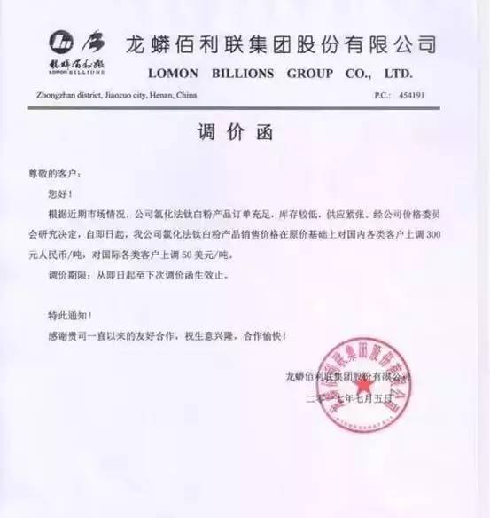 【中國涂料采購網】近日,國內鈦白粉龍頭企業龍蟒佰利在7月5日再一次上調鈦白粉價格,國內每噸上調300元,國際每噸上調50美元。而在此前鈦白粉巨頭日本石原、科慕、特諾(Tronox)剛剛在7月1日上調亞太地區各類鈦白粉價格。昨天龍蟒在漲價的提振下,股價大漲8.22%,帶動中核鈦白漲6.39%,金浦鈦業漲3.47%,安納達漲0.77%。