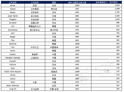 從地域看,日本是最大贏家,有10家企業(yè)入選25強(qiáng)名單,日本在汽車,造船業(yè),電子等傳統(tǒng)業(yè)務(wù)的強(qiáng)勢(shì)為其涂料企業(yè)帶來發(fā)展支撐。中國有五家涂料企業(yè)入榜,包括嘉寶莉,上海華誼精細(xì)(原上海涂料),大寶三家大陸企業(yè),以及香港的葉氏化工(國內(nèi)知名度較高的是民用品牌紫荊花)以及臺(tái)灣的永記造漆(知名品牌:虹牌)。中國雖是涂料生產(chǎn)大國,產(chǎn)量早已超越日美,但國內(nèi)各個(gè)細(xì)分涂料市場一線品牌幾乎全部被外資品牌囊括。