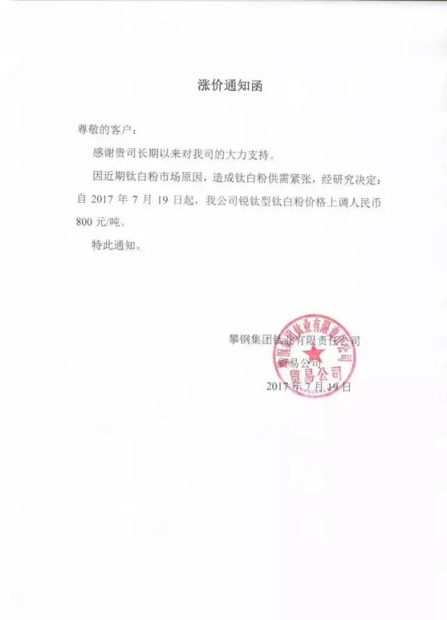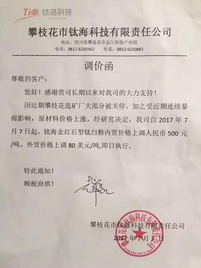上漲的企業(yè)鈦海科技 7月19日起鈦白粉上調(diào)500元/噸;