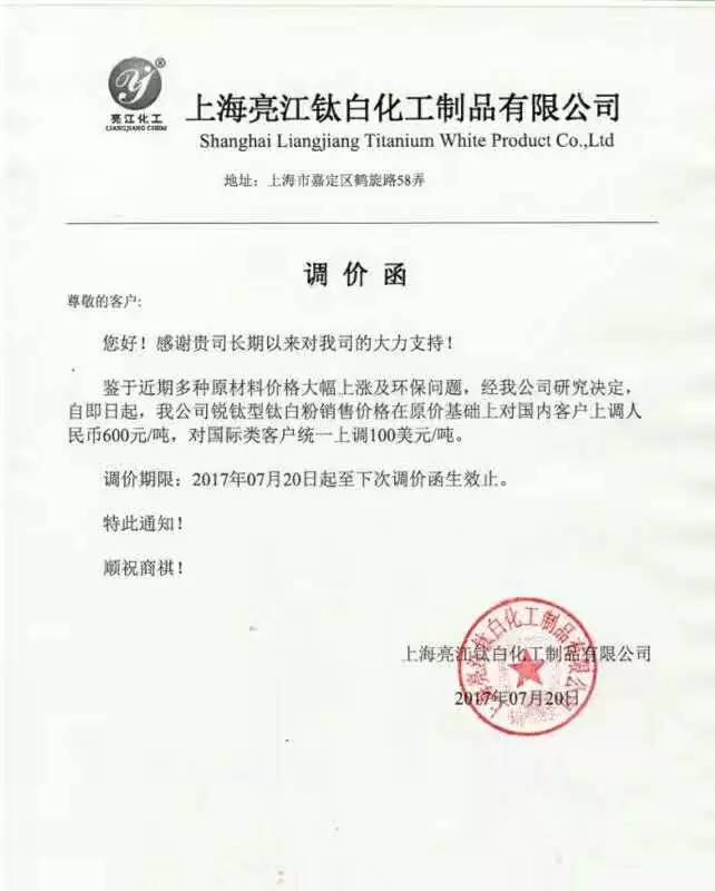 上海亮江鈦白 7月20日起上調(diào)600元/噸。