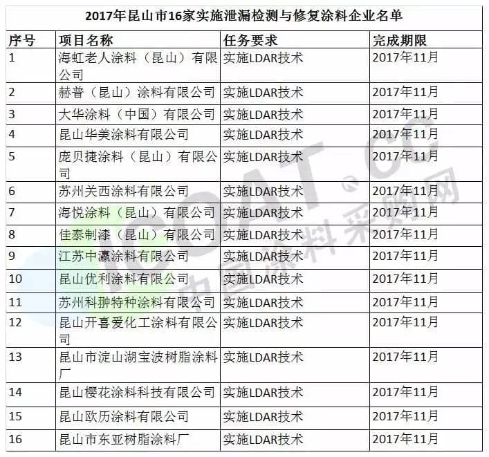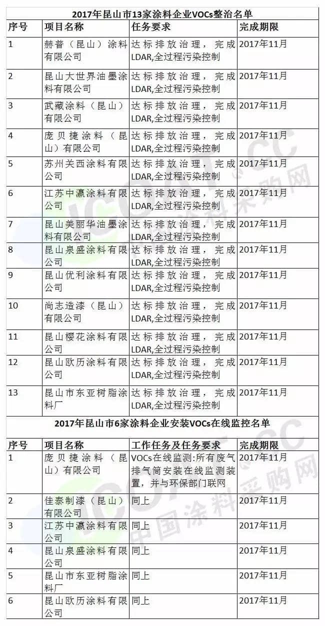 VOCs治理工作將是大氣污染治理的一個重點。隨著環保力度的日益加大,全國各省市對VOCs治理工作越來越重視。日前,江蘇昆山、浙江杭州、廣東中山先后發布了2017年企業VOCs整治項目名單。據涂料采購網統計,此次,江蘇昆山有13家涂料企業、浙江杭州大江東產業集聚區有3家涂料企業、廣東中山有10家涂料企業被列入VOCs重點整治名單,從名單中,可以看出,有些大型涂料企業,如海虹老人、龐貝捷等也被列入。在完成期限方面,廣東中山有7家涂料企業要求完成整治時間為今年10月,其他企業最晚在年底前完成整治。詳情如下: