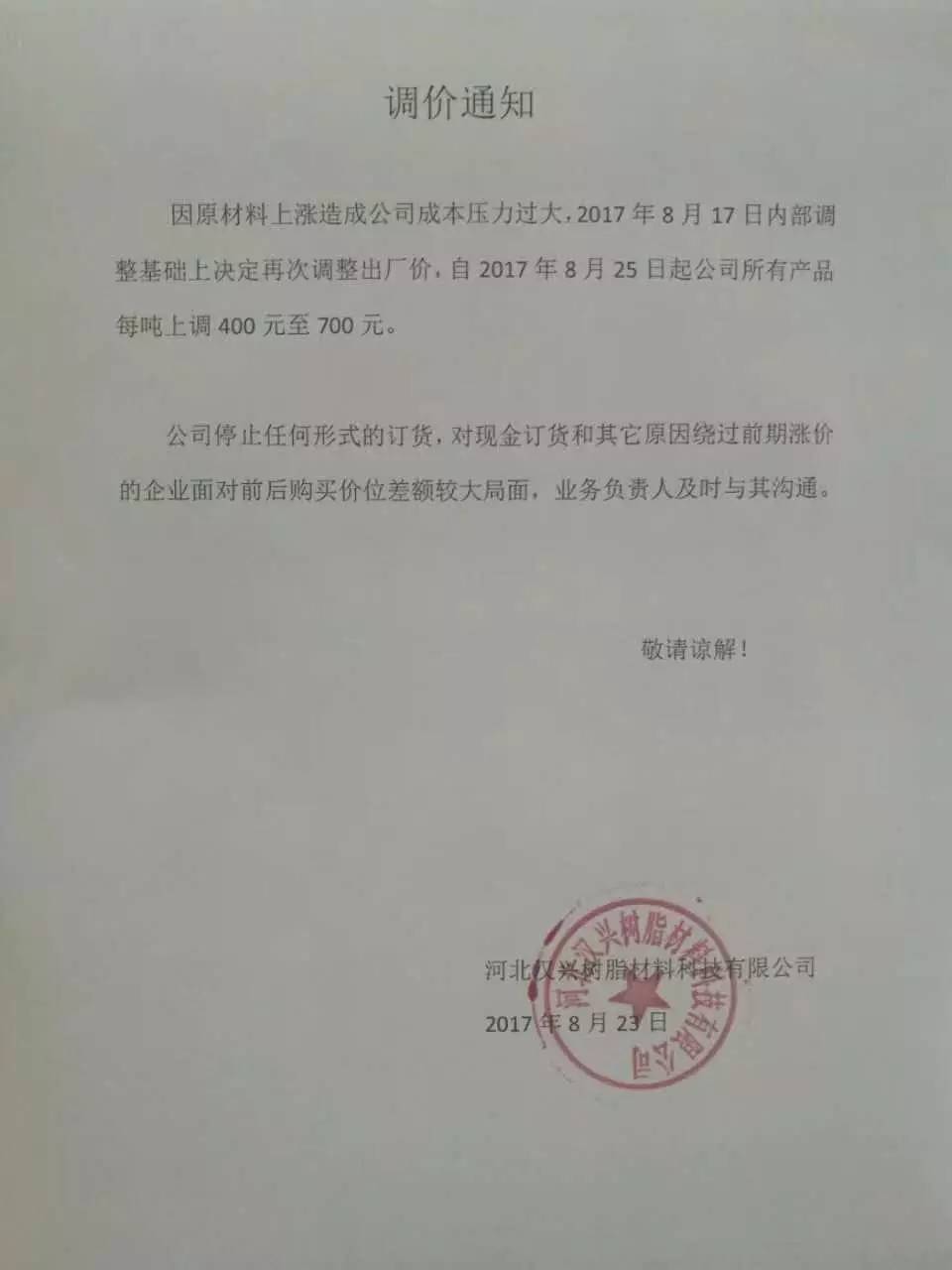 河北漢興樹脂材料科技有限公司:8月25日起,公司所有產品每噸上調400至700元。