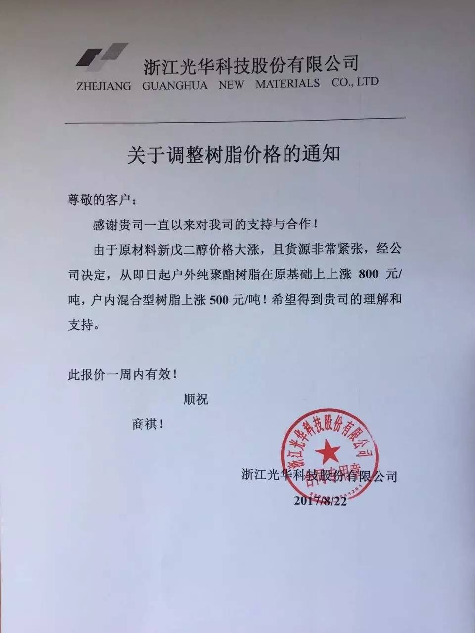 浙江光華科技股份有限公司:8月22日起,戶外純聚酯樹脂在原基礎上上漲800元/噸;戶內混合型樹脂上漲500/噸。