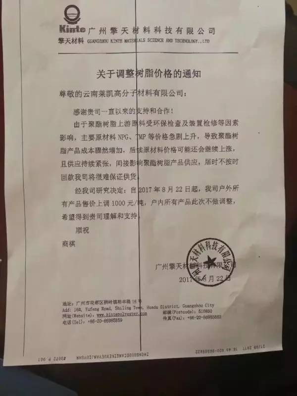 廣州擎天材料科技有限公司:8月22日起,戶外聚酯樹脂產品售價上調1000元/噸。