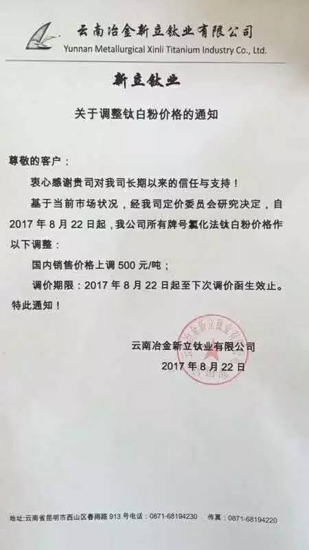 云南冶金新立鈦業有限公司:8月22日起,氯化法鈦白粉國內銷售價格上調500元/噸。