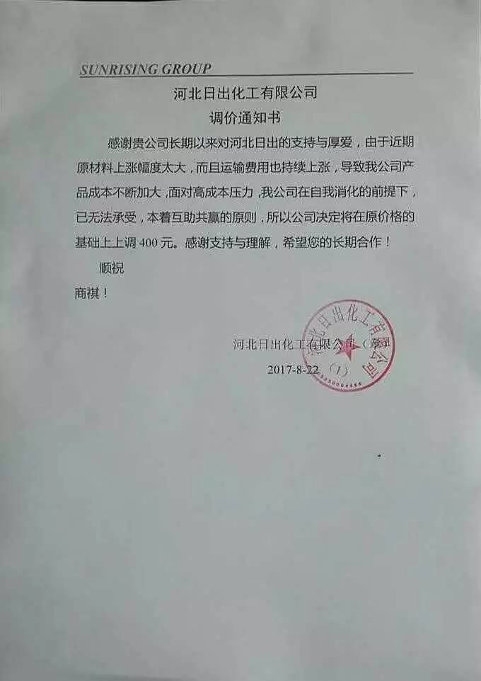 河北日出化工有限公司:8月22日起,公司產品在原價格的基礎上上調400元(每噸)。