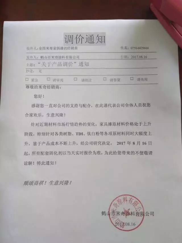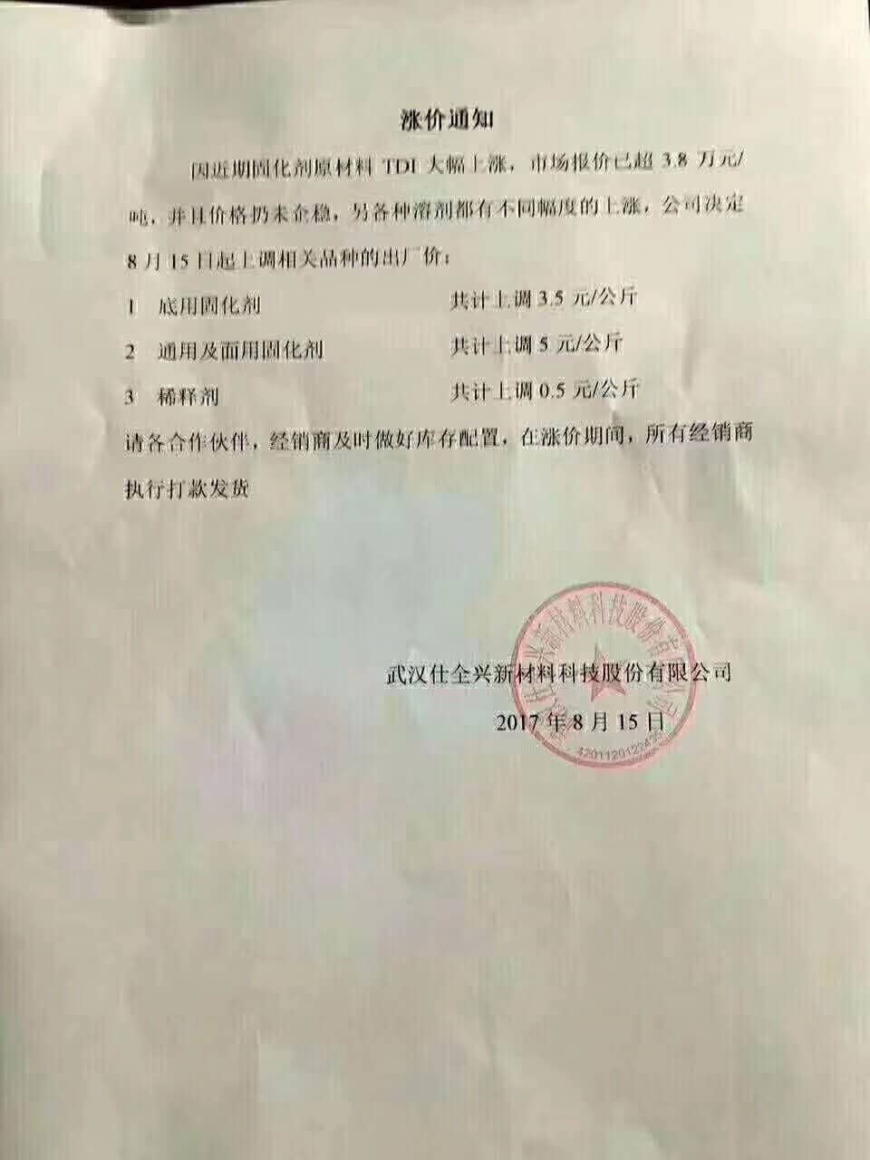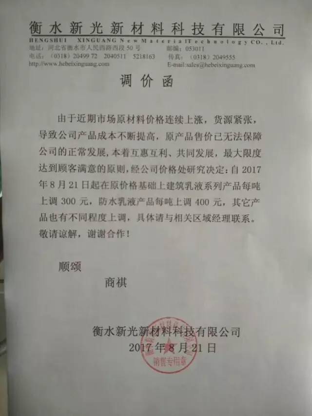 衡水新光新材料科技有限公司:8月21日起,建筑乳液系列產品每噸上調300元,防水乳液產品每噸上調400元,其他產品都有不同程度的上調!