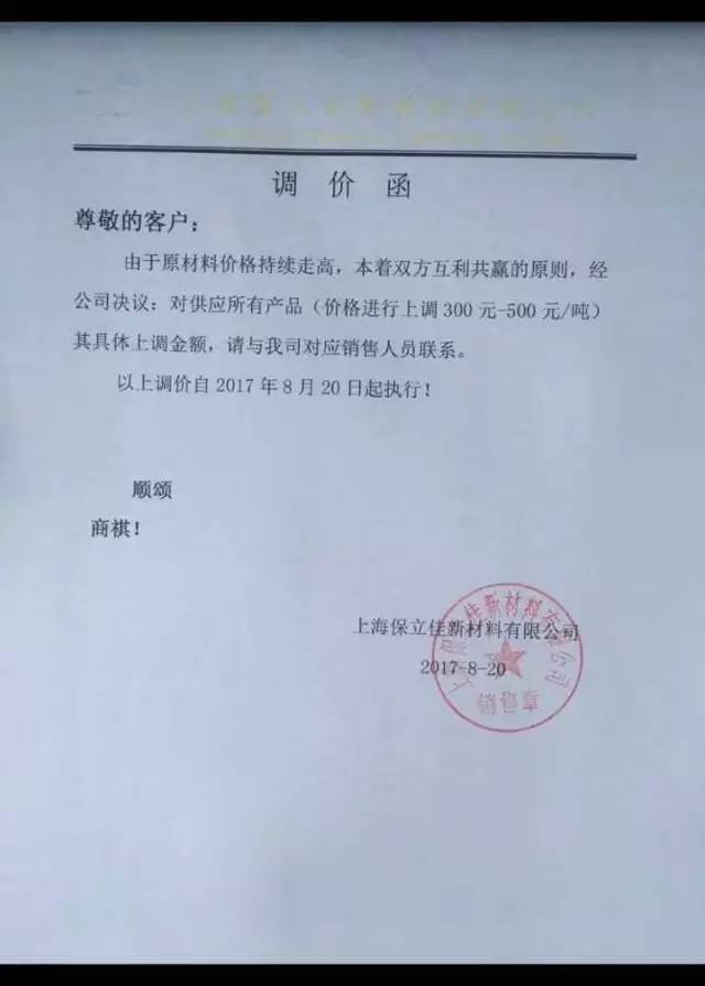 上海保立佳新材料有限公司:8月20日起,供應的所有產品上調300-500元/噸!