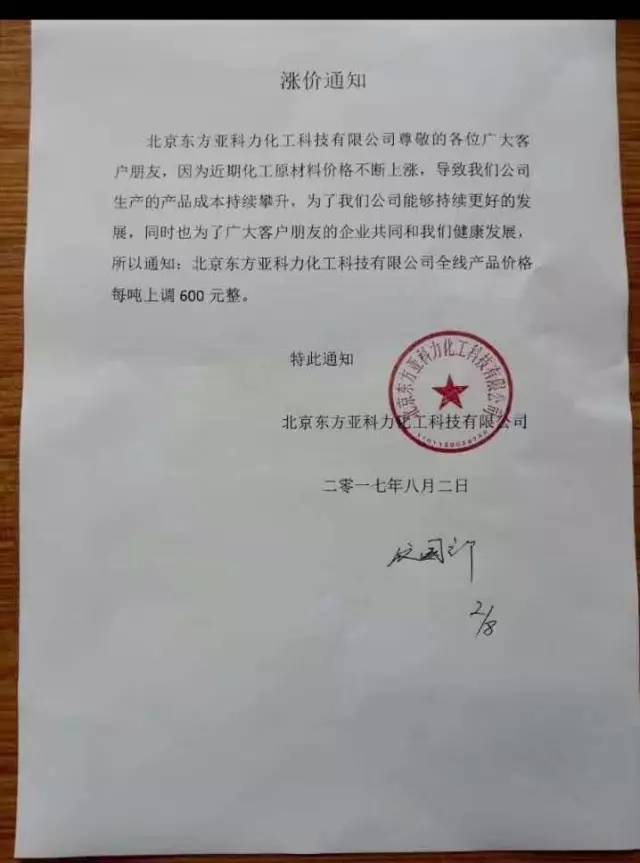 北京東方亞科力化工科技有限公司:8月2日起全線產品價格每噸上調600元整!