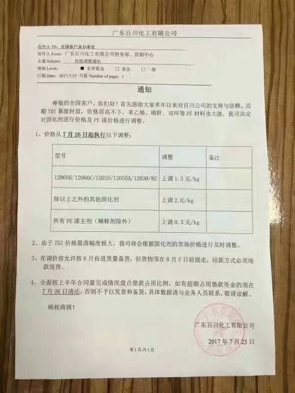 廣東依斯特新材料有限公司:8月22日起,聚酯樹脂在原基礎上上調500-1000元/噸,丙烯酸樹脂(BN-44)在原基礎上上調2000元/噸,流平劑(ET-588)在原基礎上上調1500元/噸,增光劑(ET-701)在原基礎上上調2000元/噸,鈷藍(640)、鈷綠(443)在原基礎上均統一上調20000元/噸。