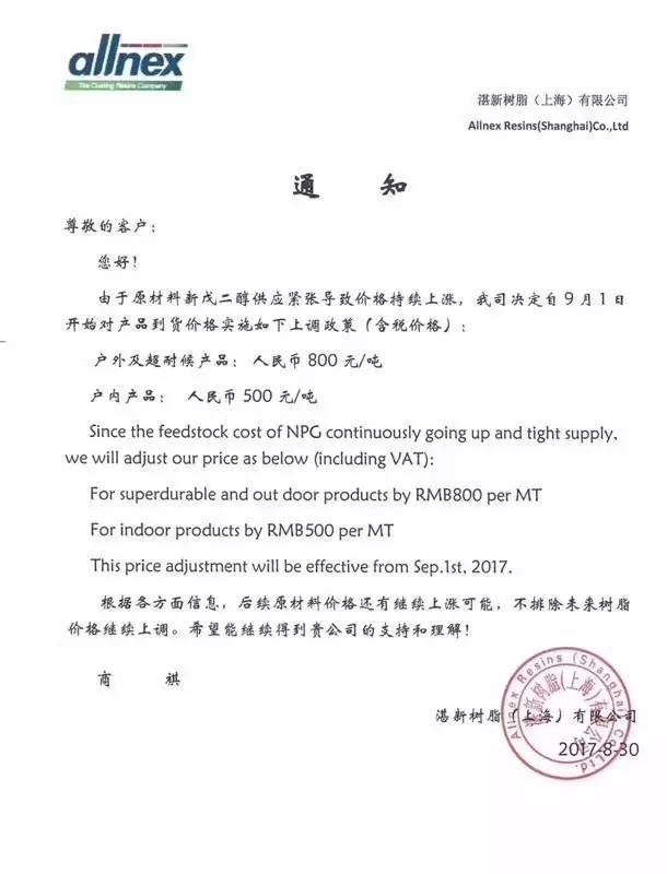 湛新樹脂(上海)有限公司,8月30日發布漲價通知,決定9月1日起,戶外及超耐候性產品上調800元/噸,戶內產品上調500元/噸。