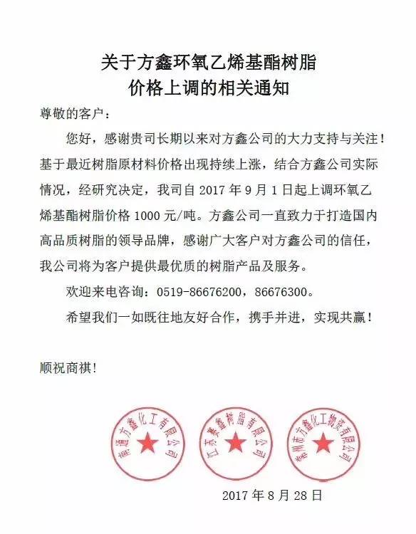 南通市方鑫化工有限公司、江蘇賽鑫樹脂有限公司、常州市方鑫化工有限公司,8月28日聯合下發了方鑫環氧乙烯基酯樹脂價格上調通知函,通知函稱,基于最近樹脂原材料價格出現持續上漲,結合方鑫公司實際情況,經研究決定,自2017年9月1日起上調環氧乙烯基酯樹脂價格1000元/噸。