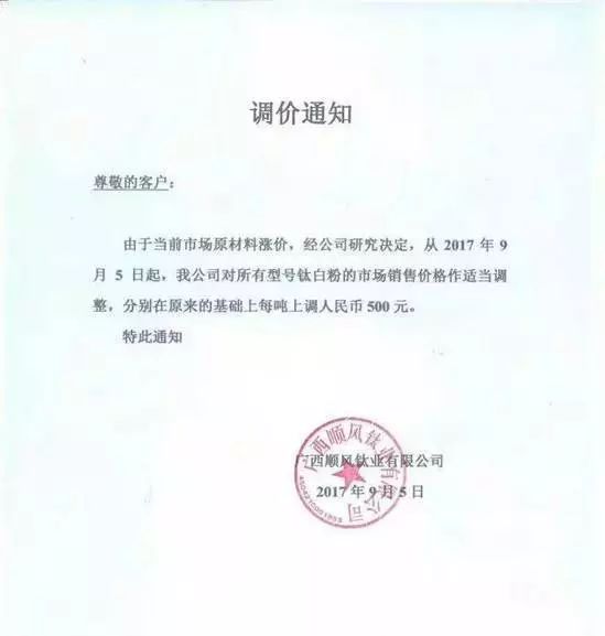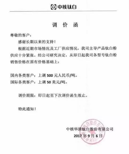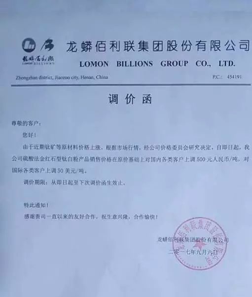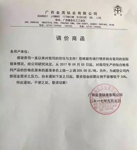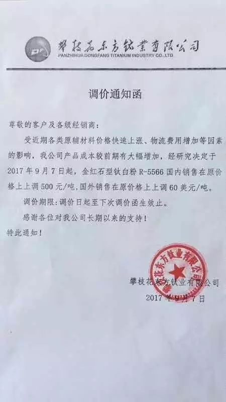除國內(nèi)鈦白粉企業(yè)之外,國際巨頭科慕公司也發(fā)出鈦白粉提價(jià)公告。公告中稱,自10月1日起,科慕旗下所有規(guī)格的Ti-Pure™鈦白粉價(jià)格在中國大陸原有的基礎(chǔ)上上調(diào)150美元/噸(合計(jì)975元/噸)。
