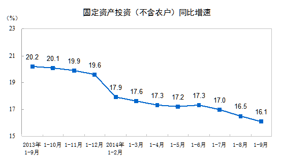 房地產行業投次力度逐漸減小,對建筑涂料行業的發展影響頗大。而固定投資不僅對房地產行業有著很大的影響,與化工、制造等行業的發展更是息息相關。據國家統計局公布的數據顯示,2014年1-9月份,全國固定資產投資(不含農戶)357787億元,同比名義增長16.1%(扣除價格因素實際增長15.3%),增速比1-8月份回落0.4個百分點。從環比速度看,9月份固定資產投資(不含農戶)增長0.77%。