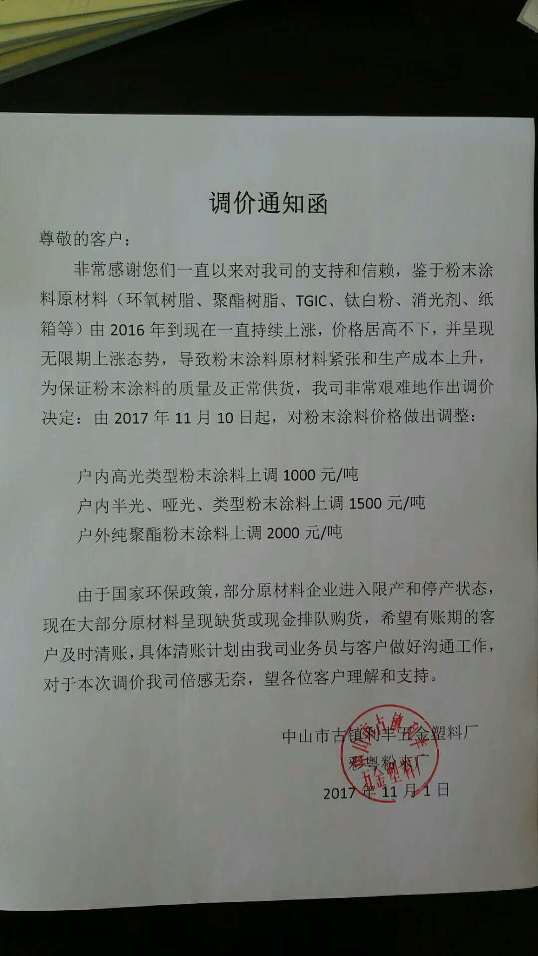據中國涂料采購網了解,11月1日,國內粉末涂料行業(yè)龍頭企業(yè)福建萬安集團等粉末涂料企業(yè)宣布上調粉末涂料價格,上調幅度為1000元/噸-2000元/噸左右。另外據中國涂料采購網了解,國內部分化工園區(qū)因為環(huán)保問題進行限產,會導致國內環(huán)氧樹脂價格進一步上漲。業(yè)內人士透漏,國內環(huán)氧樹脂將會達到19000元/噸,至于漲勢能夠持續(xù)多長時間,主要取決于上游原材料價格的走勢。