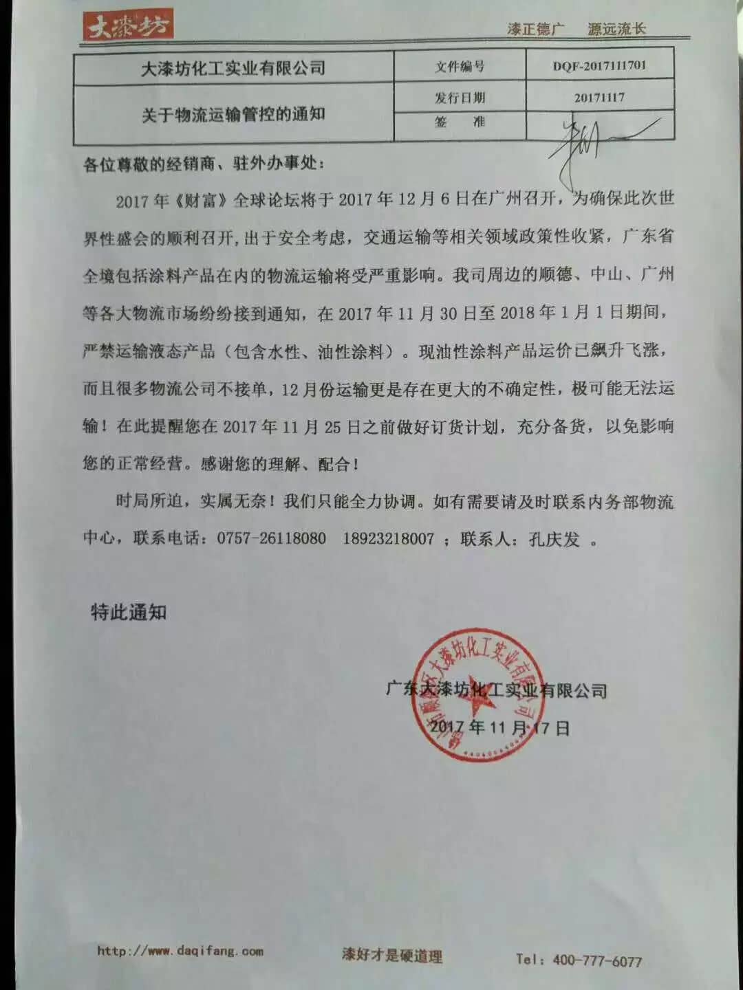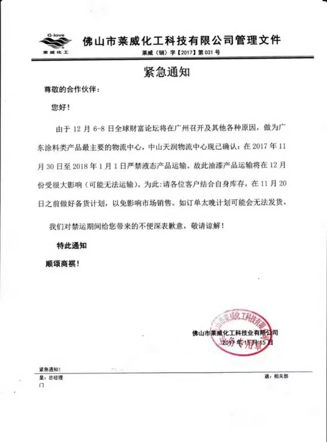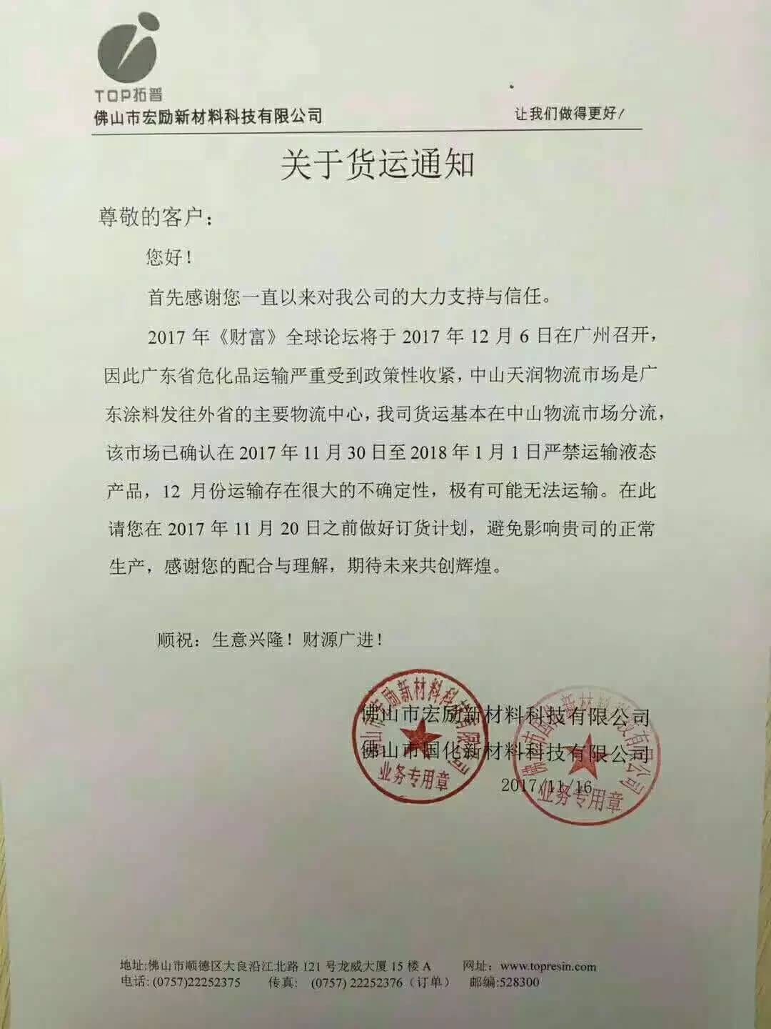【中國涂料采購網】由于12月6日-8日全球財富論壇將在廣州召開及其他各種原因,在2017年11月30日至2018年1月1日嚴禁液態產品運輸。截止11月21日,廣東地區多家涂料企業集體下發了緊急通知,提醒客戶做好庫存準備。 廣東是我國涂料第一大省,共集聚2000多家涂料企業,此次時長1個月的禁運,將對華南地區的原材料、五金、家具、家電等行業造成重大影響。