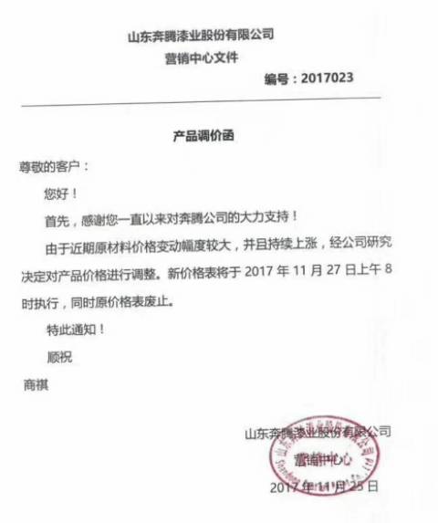 雖然原材料企業(yè)一輪又一輪的漲價,但是下游的涂料企業(yè)卻難有作為。涂料企業(yè)不光漲價難,還有大量的涂料企業(yè)依然在進行惡性競爭,因此涂料企業(yè)紛紛致電涂料采購網(wǎng),希望通過平臺呼吁一下行業(yè)的其他企業(yè),減少同業(yè)惡性競爭,建立行業(yè)的自律性,由于受到原材料漲價和人工成本增加的影響,已經(jīng)造成涂料企業(yè)出現(xiàn)行業(yè)性大面積虧損情況,企業(yè)紛紛呼吁大家理性對待市場,適當(dāng)做一些價格調(diào)整。下圖為部分涂料企業(yè)發(fā)布的漲價信息: