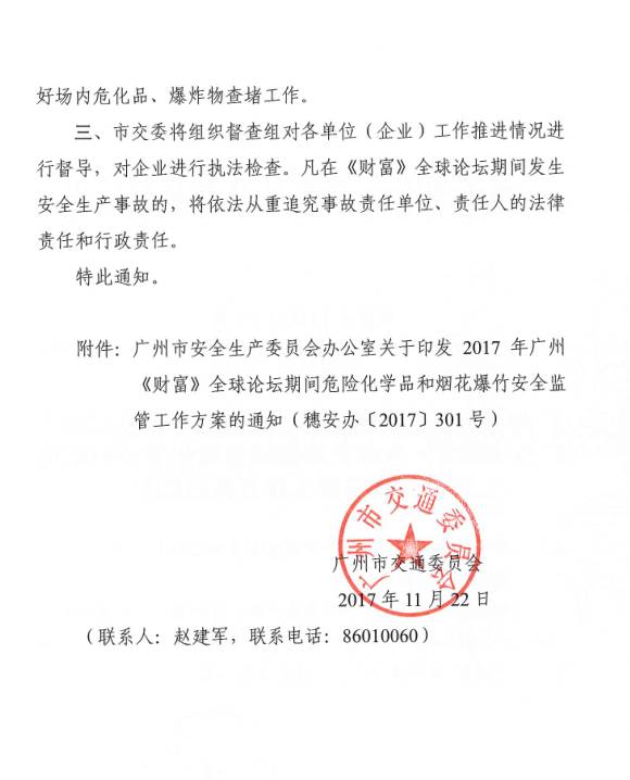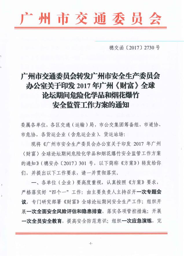 近日,廣州市交通委會員發(fā)布2017年廣州《財富》全球論壇期間危險化學(xué)品和煙花爆竹安全監(jiān)管工作方案的通知,明確了會議期間?;返倪\輸問題,全文如下: