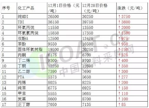 預(yù)計此次石油價格的上調(diào),會引起相關(guān)化工產(chǎn)品的價格波動。據(jù)中國涂料采購網(wǎng)信息中心統(tǒng)計,過去的一個月化工產(chǎn)品漲得最多的是純MDI,上漲3750元/噸;排名第二的是TDI,上漲3600元/噸;漲幅排第三的是環(huán)氧丙烷,上漲2000元/噸;排名第四的是環(huán)氧氯丙烷,上漲1500元/噸。環(huán)氧樹脂原材料雙酚A上漲975元/噸。與石油緊密關(guān)聯(lián)原材料,丁二烯上漲400元/噸,丙烯上漲200元/噸。其他產(chǎn)品丙烯、純苯、甲苯、炭黑等都有一定程度的上漲。