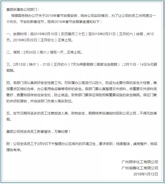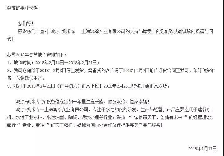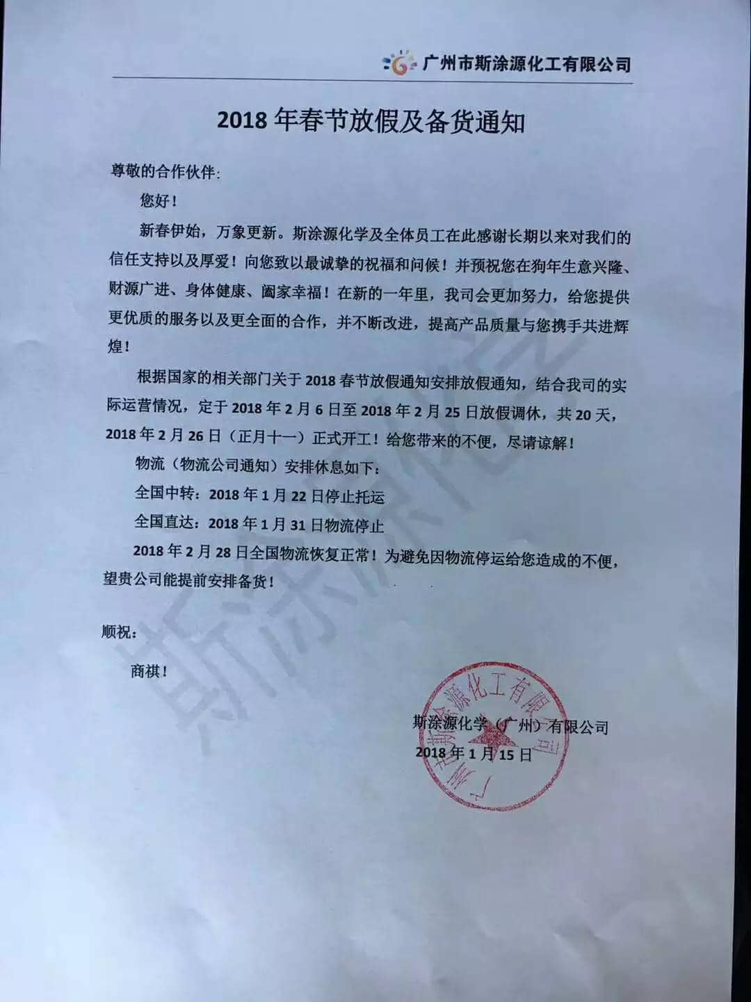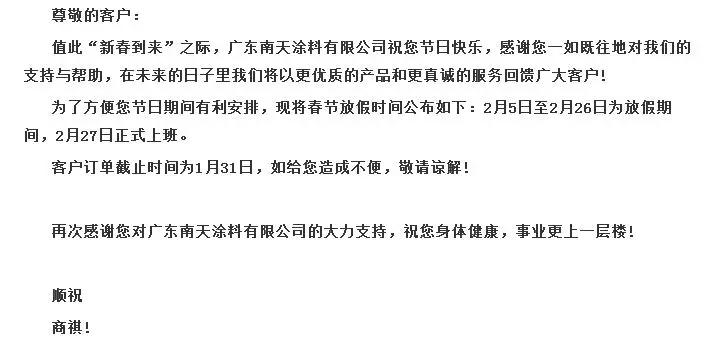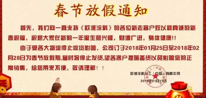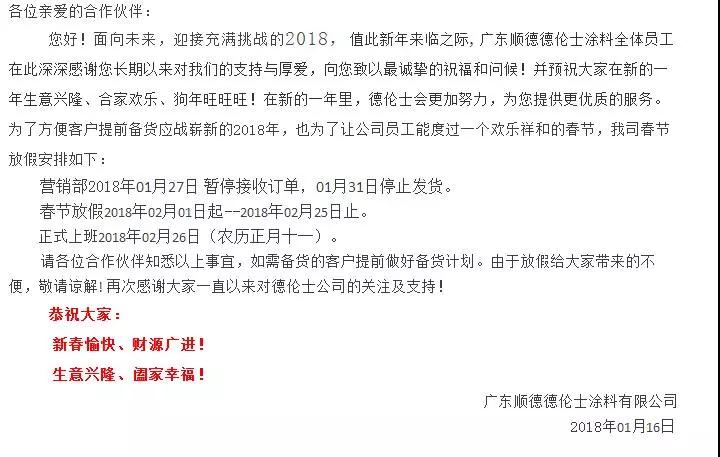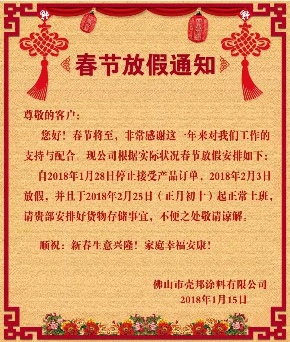 【中國涂料采購網】總結2017年涂料企業發展的關鍵詞,很多涂料企業表示:一個字“難”,兩個字“很難”,三個字“非常難”。很多中小型涂料企業在殘酷的競爭環境中選擇了放棄,有些涂料企業還在堅持。近日,中國涂料采購網收到各大涂料企業、原材料以及物流企業的2018年春節放假通知,通過對比,我們發現,2018年的春節假期普遍長于往年。很多涂料企業負責人表示:目前市場環境不好,不如給大家放一個長期,節后再說。目前大家對2018年的市場環境仍持悲觀態度。