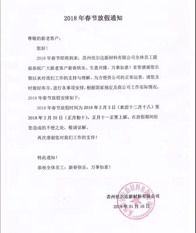 1. 蘇州佳爾達新材料有限公司(放假23天)