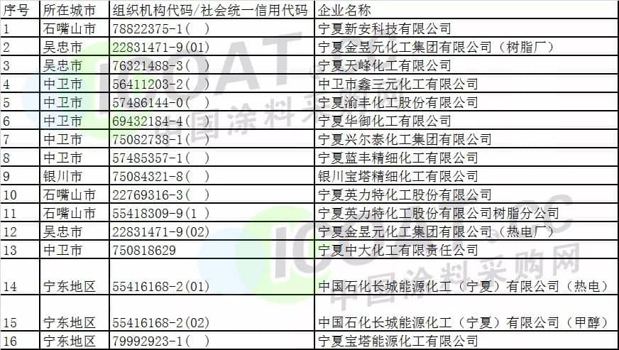 2017年寧夏重點監控污染源化工企業名單(16家)