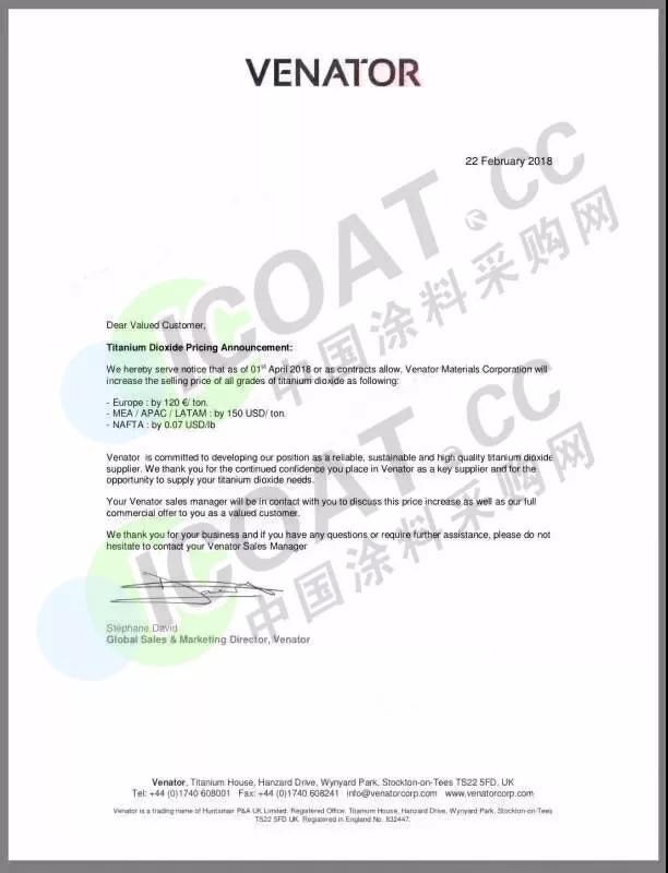 【中國涂料采購網】亨斯邁Venator正式宣布,2018年4月1日起,對于該公司生產的各種型號的鈦白粉進行提價。歐洲地區價格每噸上漲120歐元;中東、亞太、拉丁美洲地區每噸上漲150美元;北美市場上漲0.07美元/磅。