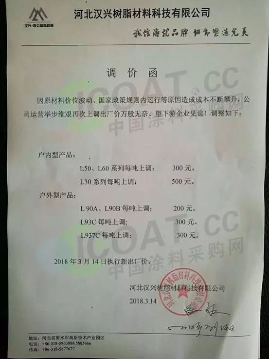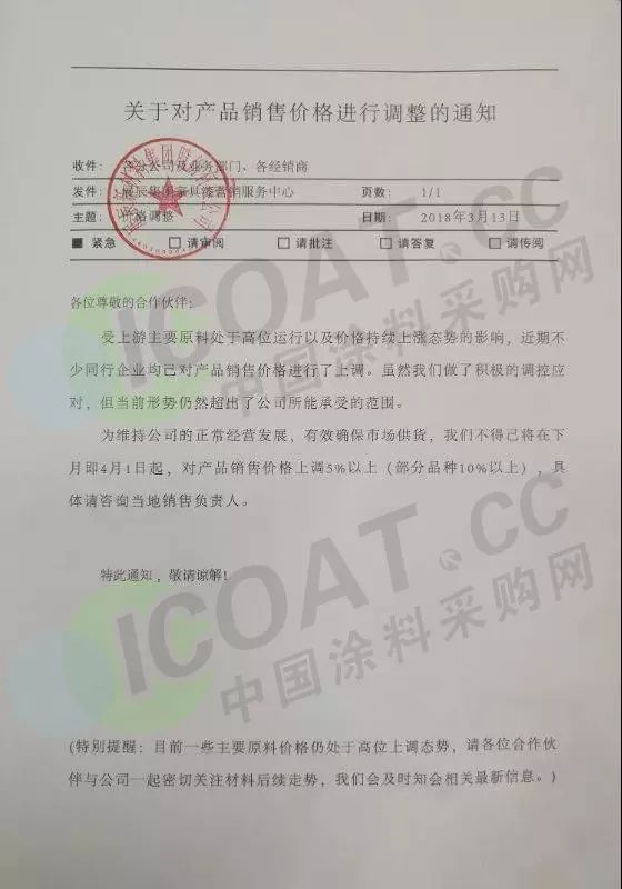 中國涂料采購網(wǎng)最新消息,3月9日巴德士發(fā)布產(chǎn)品漲價預警通知,繼廣東涂料企業(yè)漲價消息發(fā)布之后 ,展辰集團于3月13日率先發(fā)布“關于對產(chǎn)品銷售價格進行調(diào)整的通知”,宣布4月1日起對產(chǎn)品銷售價格上調(diào)5%以上(部分品種上調(diào)10%以上)。