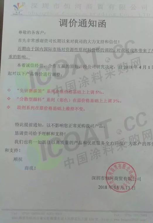 科萊恩宣布其全系列母料和包含鈦白粉、聚合物、炭黑、顏料、染料和添加劑的復合產(chǎn)品的價格,將上調(diào)4%~7%。(上漲程度取決于鈦白粉、聚合物、炭黑、顏料、染料和添加劑的質(zhì)量、等級和占比)