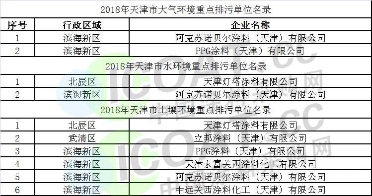 【中國涂料采購網】日前,天津市環保局印發《2018年天津市重點排污單位名錄》,其中立邦、PPG、阿克蘇諾貝爾等共6家知名涂料企業被納入重點排污名單。通知原文如下: