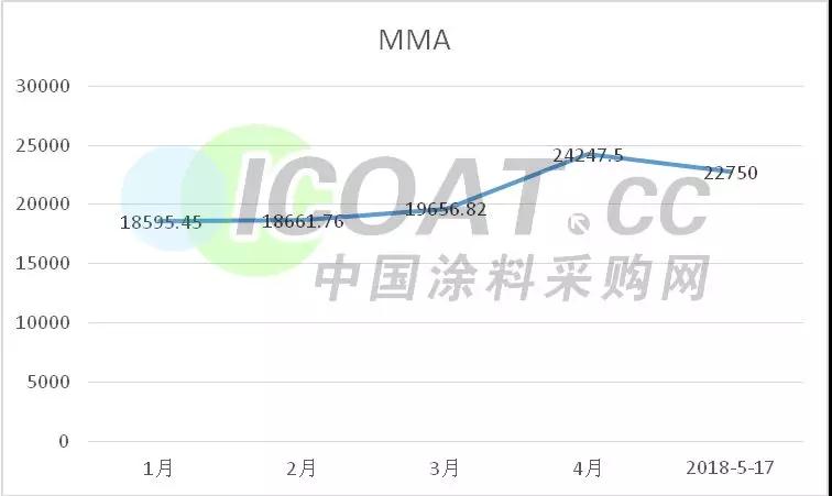 自2018年初開始,各廠陸續(xù)公布了年內(nèi)的檢修計劃,MMA市場價格在經(jīng)歷年初短暫的下跌行情過后一路上揚,并在4月初到達歷史巔峰。5月份MMA市場裝置檢修更為密集,吉林石化、惠菱化成以及璐彩特裝置均停車檢修。目前華東一級合約市場收于22500-23500元/噸,華東貿(mào)易現(xiàn)貨市場商談多在22500-23000元/噸之間展開。價格重心逐漸回歸理性。