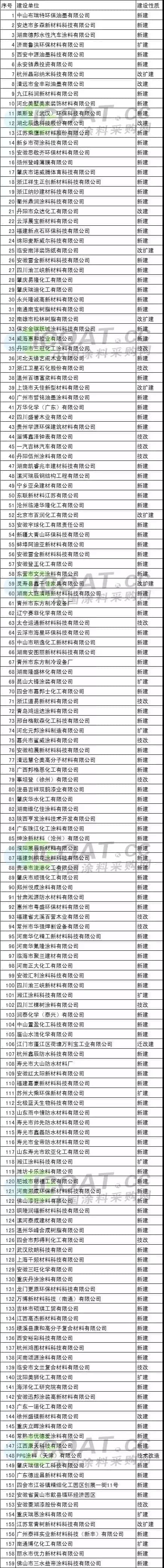 2018年1月~11月部分水性涂料及原材料建設(shè)項(xiàng)目