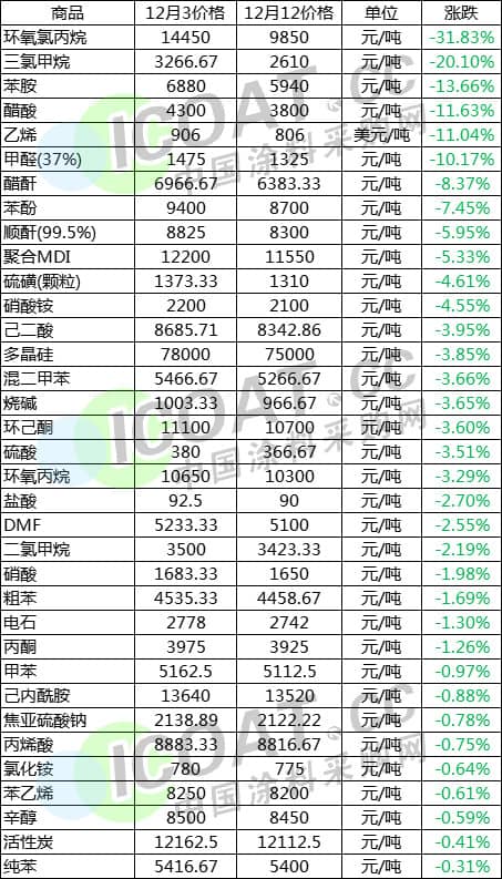 近半個(gè)月的時(shí)間以為,國內(nèi)大部分原材料產(chǎn)品價(jià)格都出現(xiàn)不同程度的下跌,部分原材料價(jià)格下滑情況如下表所示: