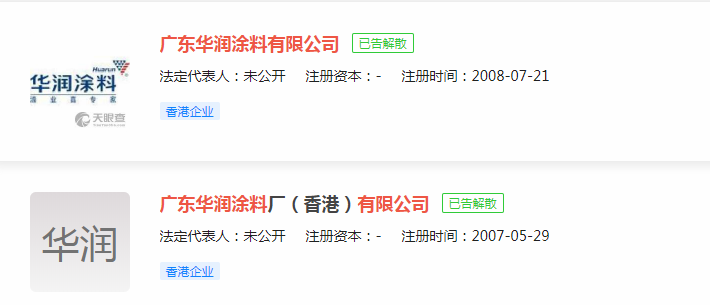 當(dāng)年,華潤涂料在被威士伯收購之后,旗下廣東華潤涂料廠(香港)有限公司和廣東華潤涂料有限公司也分別于2016年5月13日、2012年8月31日公告解散。