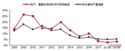 需求未來三年CAGR5.4%。通過對過去10年的數(shù)據(jù)進(jìn)行分析,我們發(fā)現(xiàn)防水材料產(chǎn)量增速與價(jià)格調(diào)整后的地產(chǎn)、基建投資加權(quán)平均增速存在線性相關(guān)關(guān)系,擬合度可以達(dá)到0.7且顯著。通過這一相關(guān)關(guān)系,結(jié)合我們對未來地產(chǎn)、基建投資的預(yù)測,即可推算未來防水材料需求增速。基于我國建筑業(yè)投資放緩的大方向,我們假設(shè)未來三年剔除價(jià)格因素后的實(shí)際地產(chǎn)、基建投資增速為3%、4%,據(jù)此估算未來三年防水材料市場規(guī)模CAGR為5.4%。