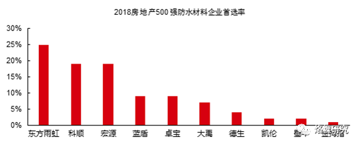 地產(chǎn)集中度提升有利于防水龍頭企業(yè)份額擴(kuò)大。2017年前十大房地產(chǎn)商銷售額占行業(yè)銷售額的24.16%,近5年來該比例持續(xù)上升。房地產(chǎn)行業(yè)呈現(xiàn)逐漸向頭部企業(yè)集中趨勢,大地產(chǎn)商的集中采購和戰(zhàn)略合作成為主流,更傾向于向大型防水供應(yīng)商采購。原因在于:(1)商品房漏水對地產(chǎn)商品牌形象影響較大,漏水風(fēng)險(xiǎn)應(yīng)盡可能降低;(2)防水成本占比不高;(3)大地產(chǎn)商看重供應(yīng)商的全國性供應(yīng)能力和資金實(shí)力。