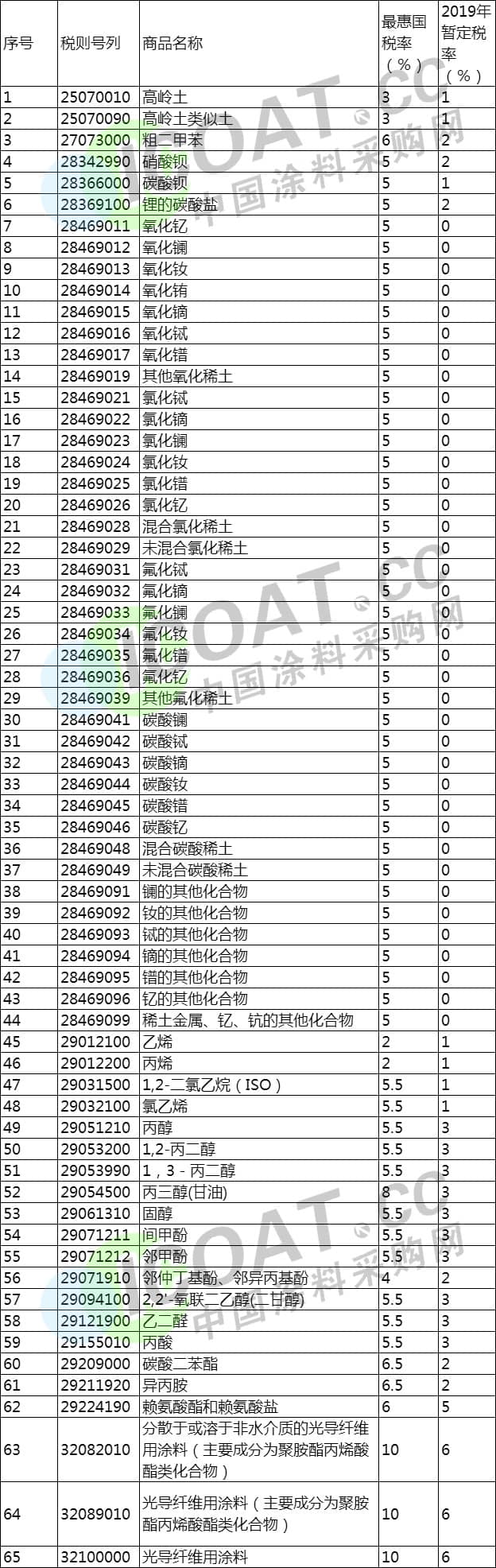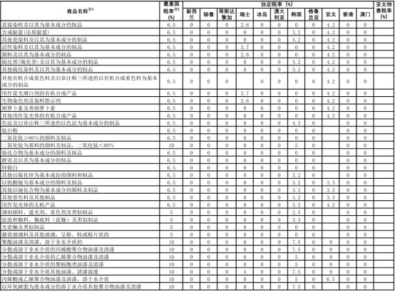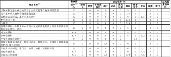 除此之外,對新西蘭、秘魯、哥斯達黎加、瑞士、冰島、澳大利亞、韓國、格魯吉亞、亞太、香港、澳門等地區的進口關稅進行了調整,對部分涂料產品的進口實現了零關稅。